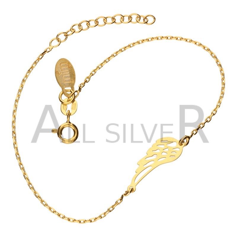 Bransoletka ażurowa z srebra próby 925, pozłacana 24-karatowym złotem, to wyjątkowy dodatek, który przyciąga uwagę. Charakteryzuje się subtelnym, a zarazem eleganckim wzorem, na którym widnieje delikatne skrzydło anioła, widziane z boku. Bransoletka ma długość 18 cm, a dodatkowo wyposażona jest w 3-centymetrową przedłużkę, co umożliwia jej dopasowanie do różnych rozmiarów nadgarstka. Dzięki staranności wykonania i użyciu wysokiej jakości materiałów, ta bransoletka stanowi doskonały wybór na wyjątkowe okazje, podkreślając indywidualny styl i dodając subtelnej elegancji.