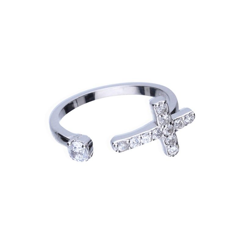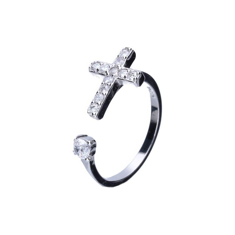 PIERŚCIONEK OTWARTY, KRZYŻYK, SREBRO 925 RODOWANE, BIAŁE CYRKONIE.