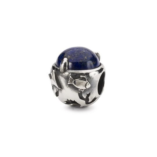 Trollbeads Day Ocean to lapis lazuli otoczony szczegółowym projektem ze srebra. Zanurz się i odkryj niesamowite życie oszałamiającego konika morskiego, fantazyjnej ryby, tańczących wodorostów i pięknej syreny.