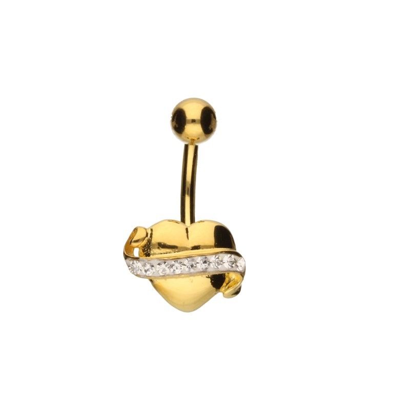KOLCZYK DO PĘPKA, POŁĄCZENIE SREBRA PRÓBY 925 ZE STALĄ CHIRURGICZNĄ, CYRKONIE W KOLORZE BIAŁYM, SERCE, ZŁOCONE.