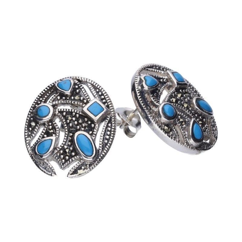Biżuteria srebrna 925 z markazytami i turkusami to efektowny i kolorowy dodatek do Twojej kolekcji. Wykonane z najwyższej jakości srebra próby 925, kolczyki prezentują delikatnie wkomponowane markazyty, które błyszczą i przyciągają uwagę. Dodatkowo, ozdobione są pięknymi turkusami, które nadają im wyjątkowego uroku i egzotycznego charakteru. Te ujmujące kolczyki srebrne 925 z markazytami i turkusami są doskonałym wyborem dla tych, którzy pragną nosić biżuterię, która emanuje kolorem, pięknem i wyrazistością.