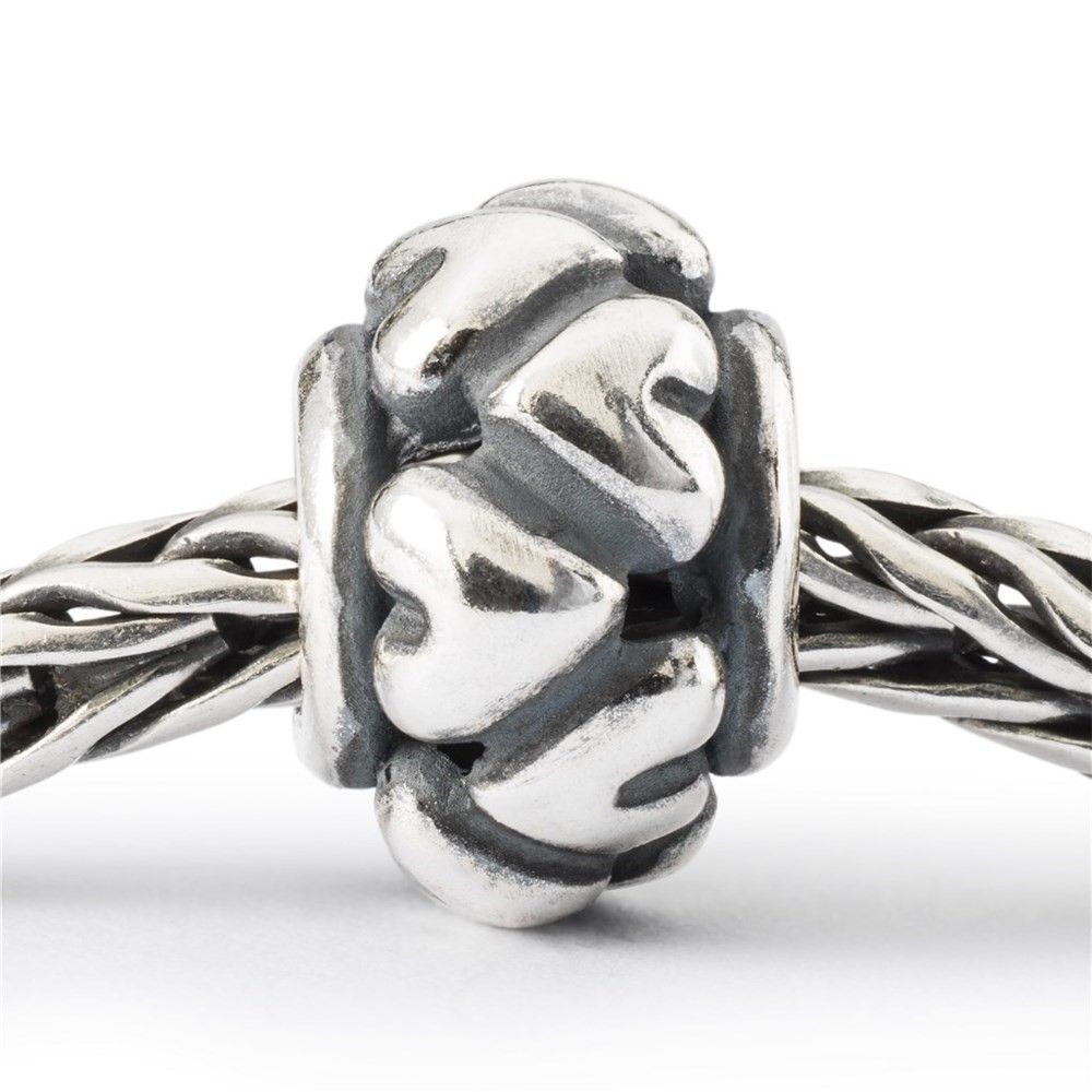 Na koraliku Together znajduje się drobny rząd słodkich małych srebrnych serduszek.
