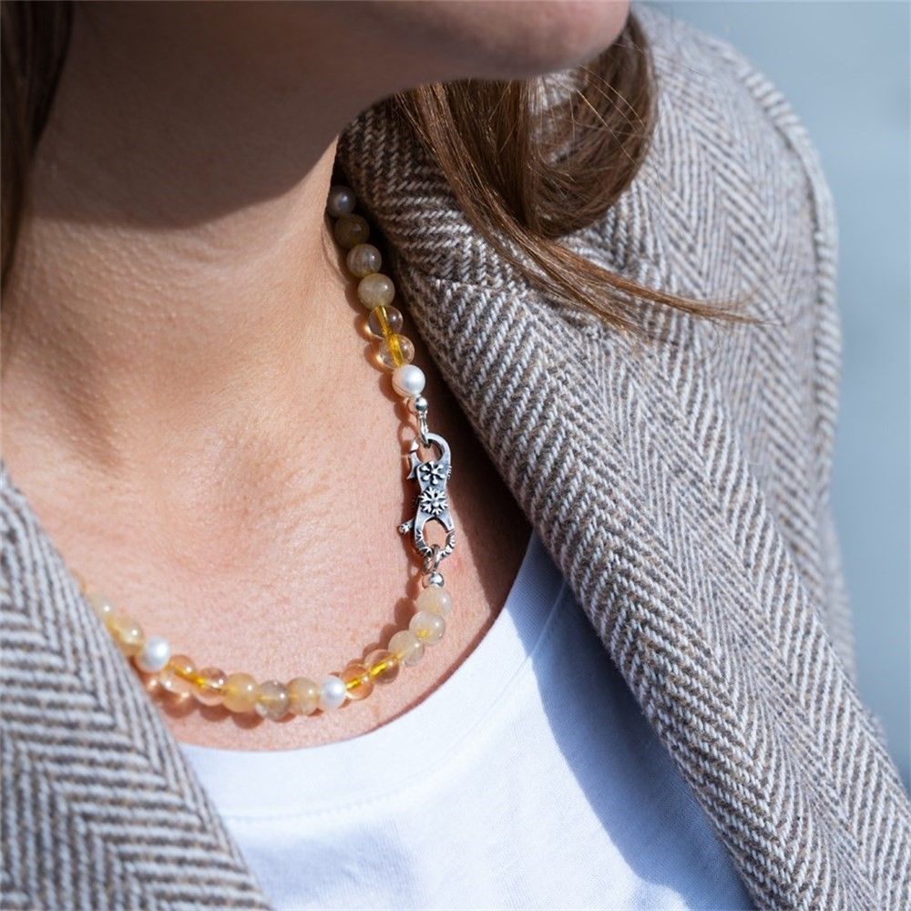 Ręcznie wykonany naszyjnik z kamieni szlachetnych z cytrynem, złotym kwarcem rutylowanym i perłami słodkowodnymi.