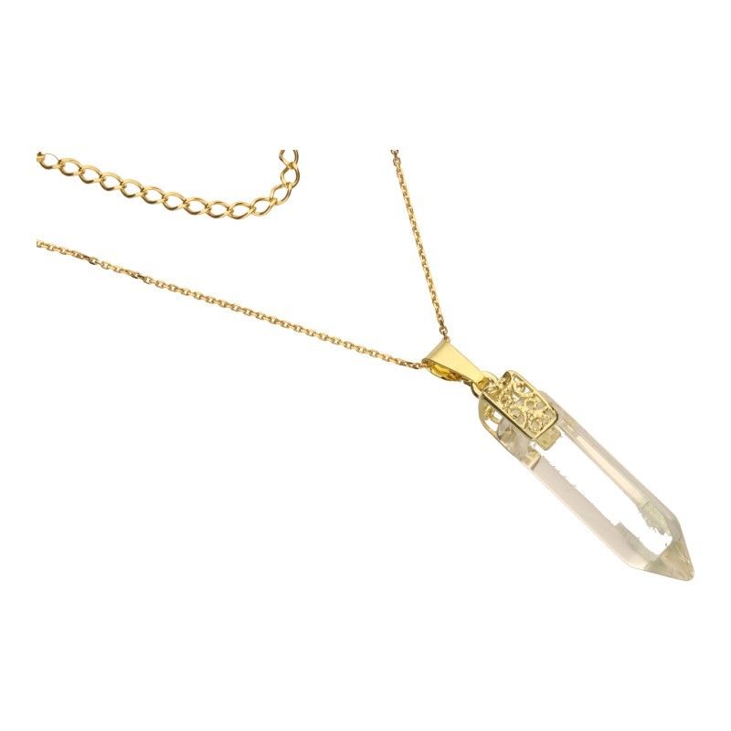 Srebrny, pozłacany naszyjnik z kamieniem naturalnym kryształem górskim w delikatnym okuciu to elegancki i oszałamiający dodatek, który emanuje czystością i jasnością. Złocenie na srebrnym naszyjniku nadaje mu subtelnego blasku, podkreślając jednocześnie detale ażurowego okucia. Kształt grota, przypominający ostre kamienie, dodaje mu mistycznego charakteru, wprowadzając element siły i tajemnicy. Kryształ górski umieszczony w okuciu stanowi centralny punkt naszyjnika. Jego przejrzystość i jasność tworzą efektowną grę świateł, przyciągając wzrok i dodając mu oszałamiającego blasku, tworząc harmonijną kompozycję z pozłacanym naszyjnikiem. Ten naszyjnik to nie tylko piękny dodatek do stroju, ale również wyrazisty element biżuterii.