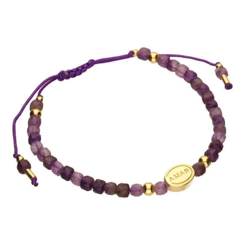 BRANSOLETKA NA SZNURKU JUBILERSKIM Z FASETOWANYMI KAMIENIAMI NATURALNYMI O ŚREDNICY 5mm, W ODCIENIACH KOLORU FIOLETOWEGO, ELEMENTY ZE SREBRA PRÓBY 925 POZŁACANEGO 24 KARATOWYM ZŁOTEM, DŁUGOŚĆ REGULOWANA ZA POMOCĄ SZNURECZKA, OWALNY ELEMENT Z NAPISEM "AMAR" O WYMIARACH 10mm X 8mm.