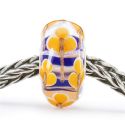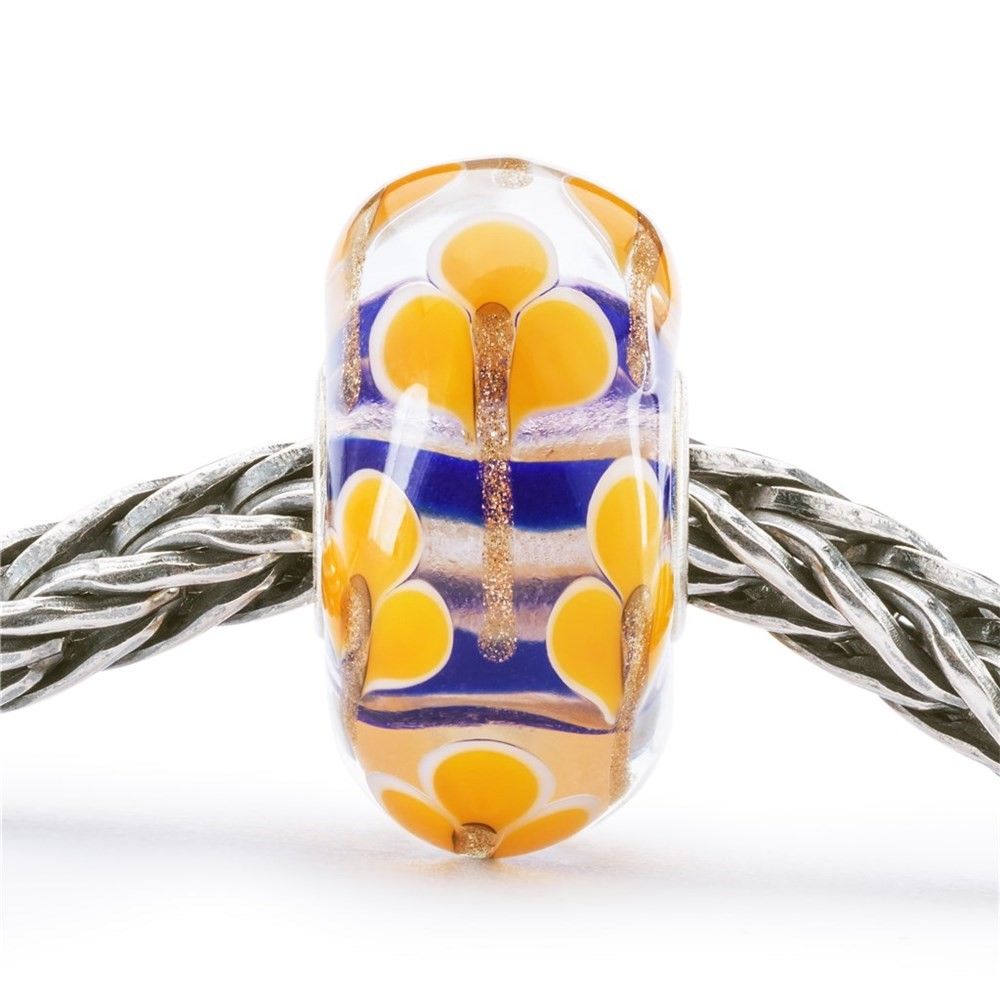 Ciepłe żółte kwiaty z błyszczącymi, złotymi łodygami zdobią ten szklany koralik w niebieskie i brokatowe paski.