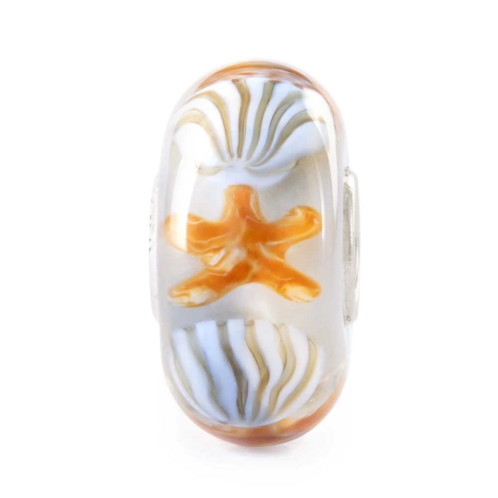 Ten szklany koralik ma dwukolorowy wygląd, z głębszą warstwą beżowego szkła, która przywołuje uczucie ciepłego, miękkiego piasku. Zewnętrzna warstwa jest delikatnie niebieska, ozdobiona pięknie szczegółowymi muszlami i rozgwiazdami — jak słoneczne poszukiwanie skarbów wzdłuż linii brzegowej.